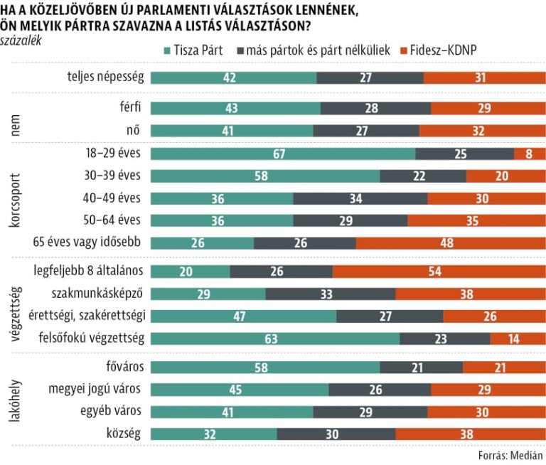 A közvélemény-kutatások szerint a fiatalok nagy többsége nem Orbán Viktor maradására szavaz majd. A Medián márciusi felmérése szerint a harminc évesnél fiatalabbak 67 százaléka szavazna a Tisza Pártra és csak 8 százalék voksolna a jelenlegi kormánypártra. Ez tehát nagyjából félmillió ellenzéki szavazatot jelentene. Az viszont már más kérdés, hogy a változást akaró fiatalok elmennek-e szavazni.