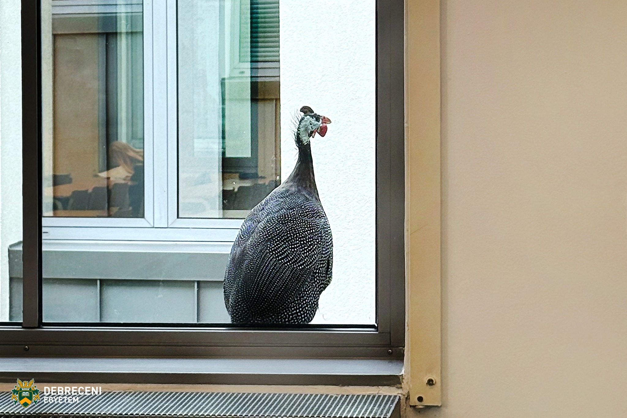 Debrecenben nem lepődnek meg, ha egy gyöngytyúk ül az egyetem ablakában. kép: Facebook/Debreceni Egyetem