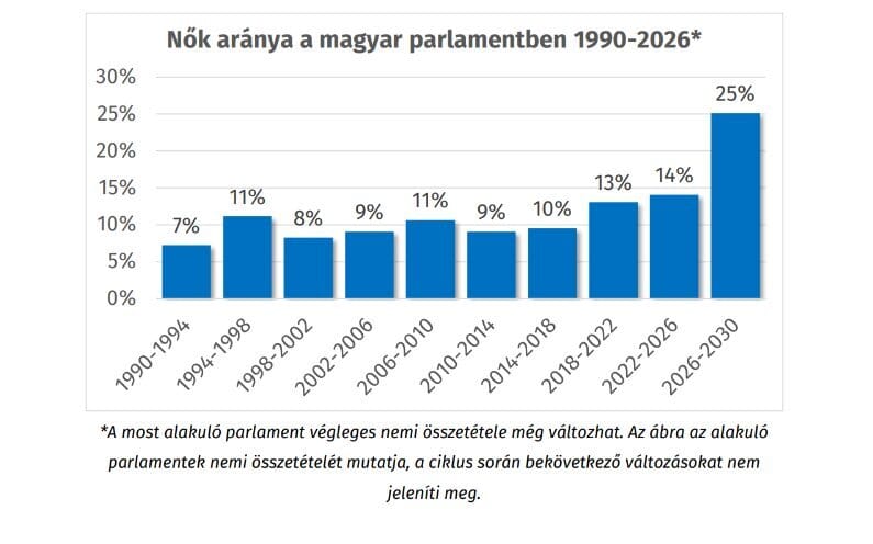 Hárommal több nő lesz az új országgyűlésben, mint ahány fideszes képviselő. A Tisza Pártban 44, a Fidesz-KDNP-ben 9, és a Mi Hazánk képviselőcsoportjában 2 nő fog részt venni a parlamenti munkában. Ez 55 képviselőt jelent összesen. Ilyen sok nő még sosem ült a magyar országgyűlésben, a képviselők picit több mint negyede kerül most ki közülük. Viszont, ha azt vesszük, hogy a nők a társadalom felét teszik ki, ez a szám még mindig kevésnek tűnik.