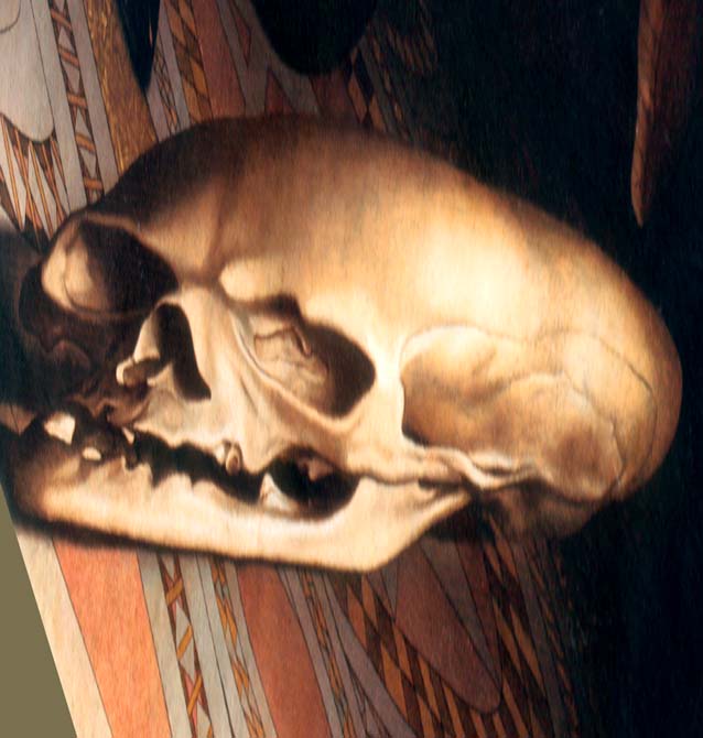 Holbein képén, ha azt alulról és a megfelelő szögből nézzük, egy koponya látható. A koponya egyébként gyakori motívum a reneszánsz képeken, ez az úgynevezett memento mori, vagyis a halálra való emlékeztetés. A középkori kereszténység szerint ez emlékeztetés azért kellett, hogy az emberek tudják, hogy az élet véges. Ezért azt tudatosan, méltósággal és az időt kihasználva kell megélni.