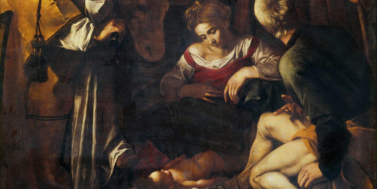 Caravaggio: Jézus születése Szent Ferenccel és Szent Lőrinccel (1609). Ma már csak a festmény másolata látható a kép eredeti helyén. Kép: Wikipedia