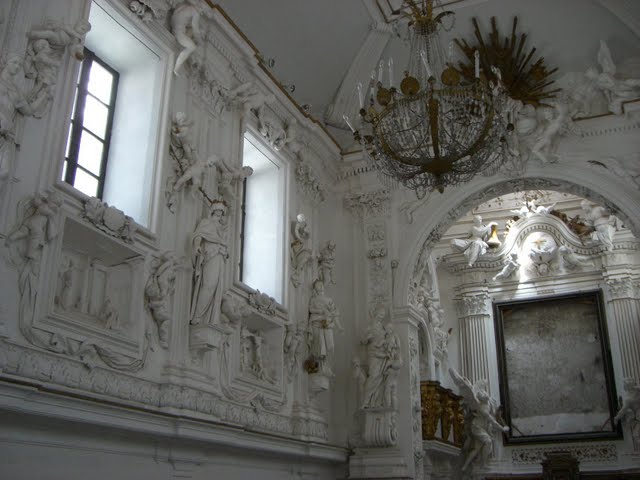 A Szent Lőrinc-oratórium belseje, innen lopták el a festményt. A háttérben a képkeret, amiből a festményt kivágták. Kép: Wikipedia