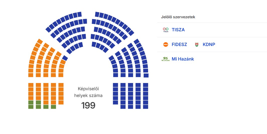 Kedd délután így nézett ki a parlament összetétele. A kék ülések a Tiszát, a narancs a Fideszt és a zöld a Mi Hazánkat jelenti. De ez még változhat. Forrás: Nemzeti Választási Iroda