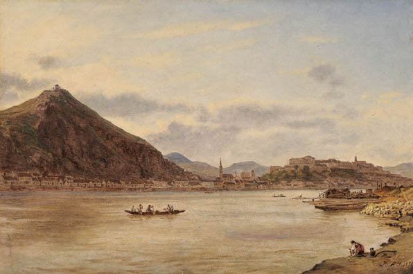 Rudolf von Alt metszete a Gellért-hegyről, itt már látható az Uraniae nevű csillagvizsgáló a tetején. Kép: Wikipedia