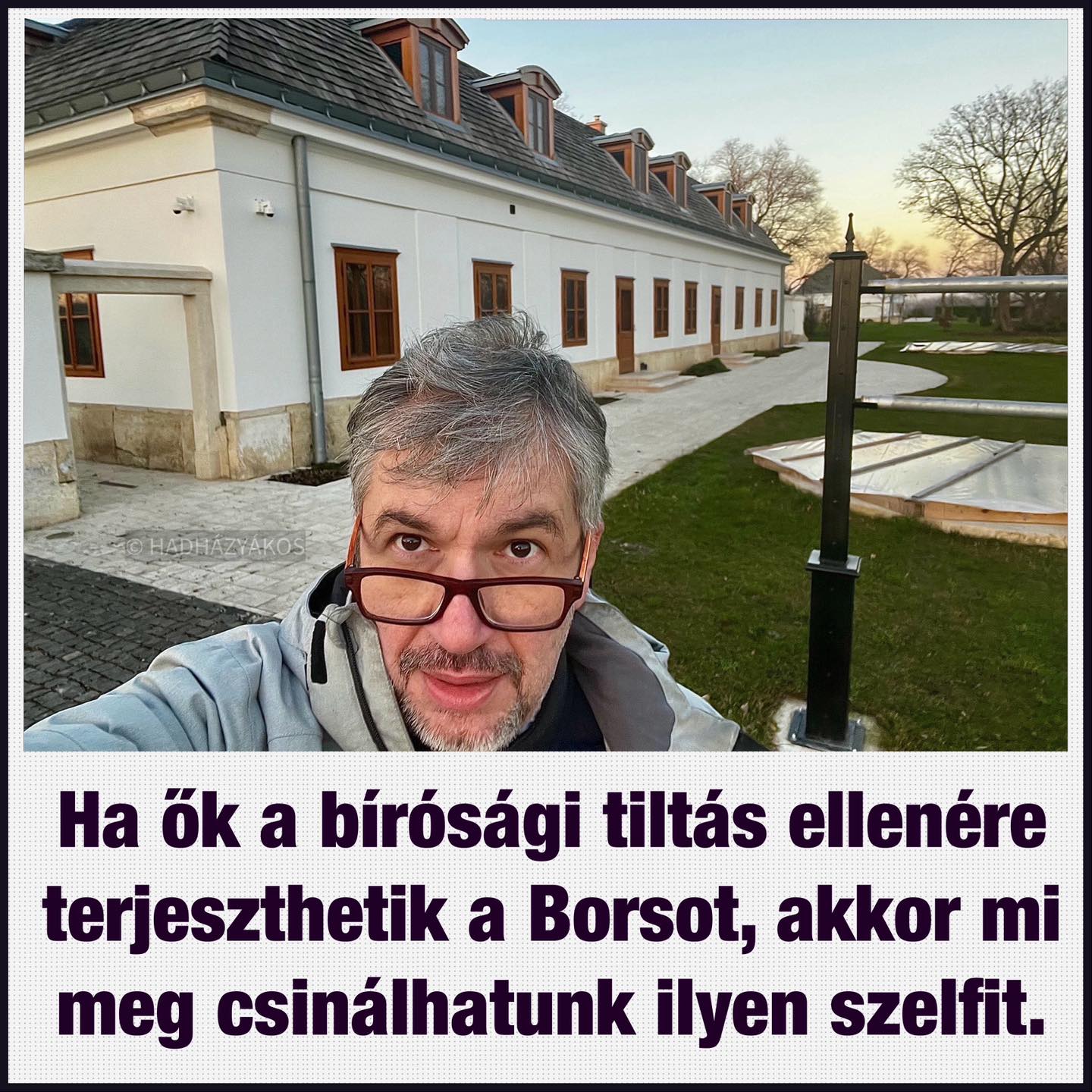 Újabb képeket készített a hatvanpusztai luxusmajorságról Hadházy Ákos. A képviselő szelfizett is az üresen álló ingatlan területén, ahova simán be tudott sétálni. Ahogy írta: „ha ők a bírósági tiltás ellenére terjeszthetik a Borsot, akkor mi is csinálhatunk ilyen szelfit”. Azt is írta a posztjában, hogy látszik, hogy a kormányfő és családja nem itt töltötte az ünnepeket. Orbán Viktor karácsonykor közzétett családi képei egyébként a lánya, Ráhel, és veje, Tiborcz István budapesti otthonában készülhettek. (Facebook/Hadházy Ákos)