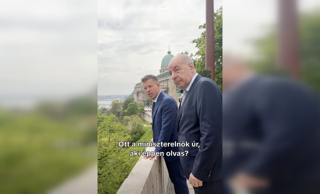 A találkozó legjobb pillanatáról Magyar Péter posztolt ki egy videót. Ezen az látszik, hogy miközben Sulyokkal sétál a Sándor-palota erkélyén, a szomszédos Karmelita kolostor erkélyén éppen Orbán Viktor mászkál fel-alá. A leköszönő miniszterelnök közben olvasgatott valamit.