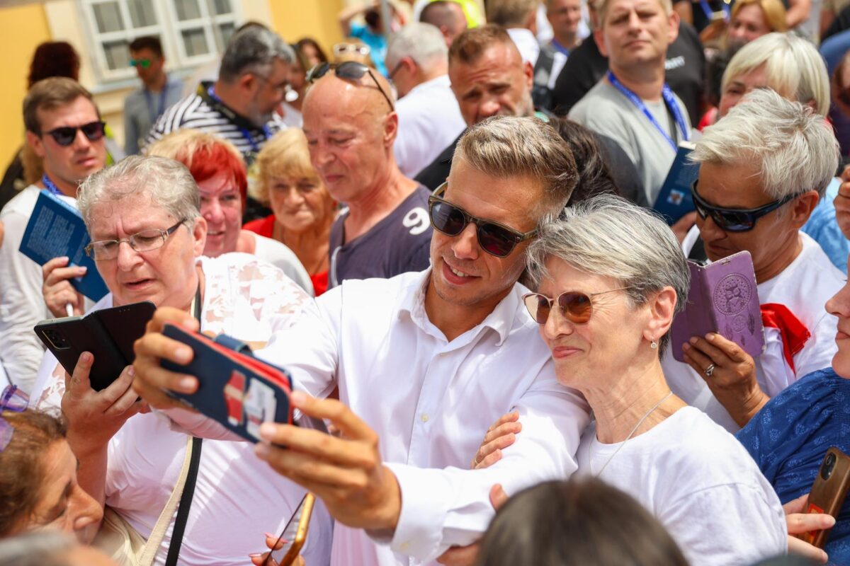 A Tisza elnöke az őt támogatókkal szelfizik 2025 augusztusában. Fotó: Magyar Péter