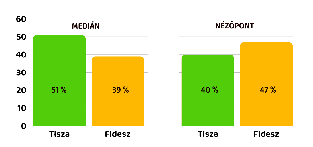 A Medián és a Nézőpont januári eredményei: ennyien szavaznának a két nagy pártra, százalékban. Majdnem pontosan ellentétes számok, és mindkettő nem lehet igaz.