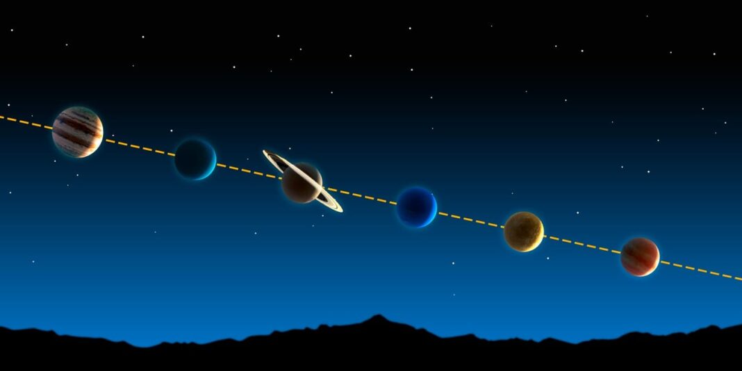 Nem egy kupacban lesznek az égboltoton a bolygók, hanem egy hosszú ív mentén „felsorakozva”, mintha csak felvonulnának az égen. Az ilyen összeállásokat bolygóparádénak is szokták becézni.