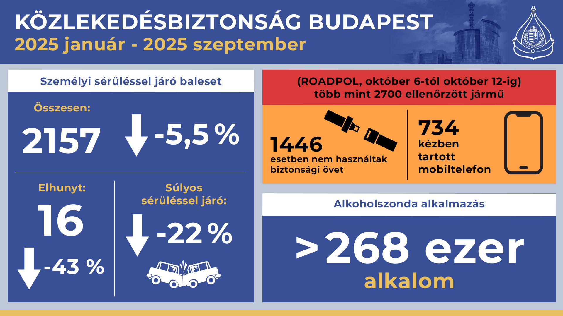 Idén az első kilenc hónapban 2157 sérüléssel járó közúti baleset történt Budapesten, ami 5,5 százalékkal kevesebb, mint 2024 azonos időszakában.